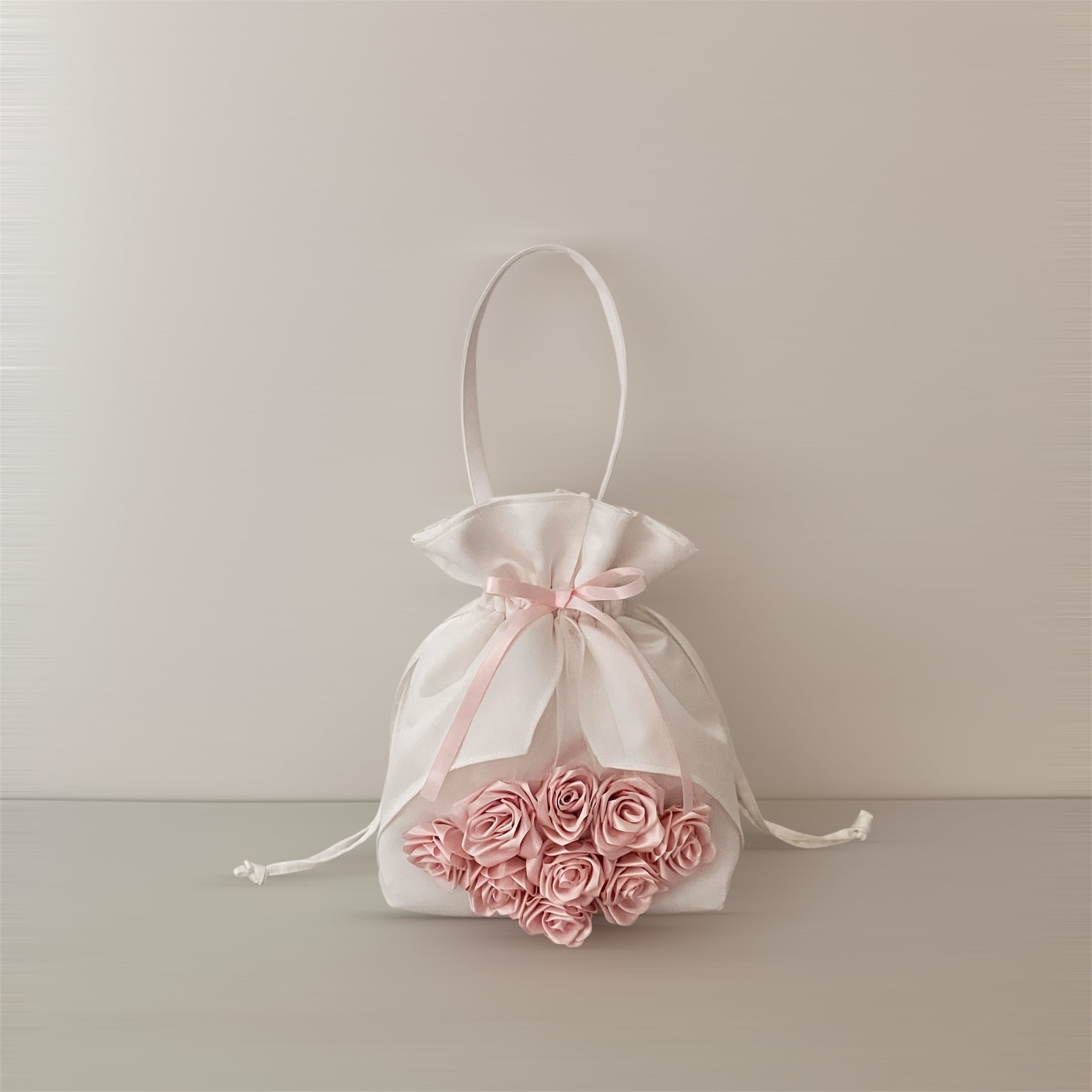 特別な一日を彩る、まるでブーケのようなエレガントな巾着バッグ。 上質な生地と立体的なローズの装飾が、装いを一層華やかに引き立てます。