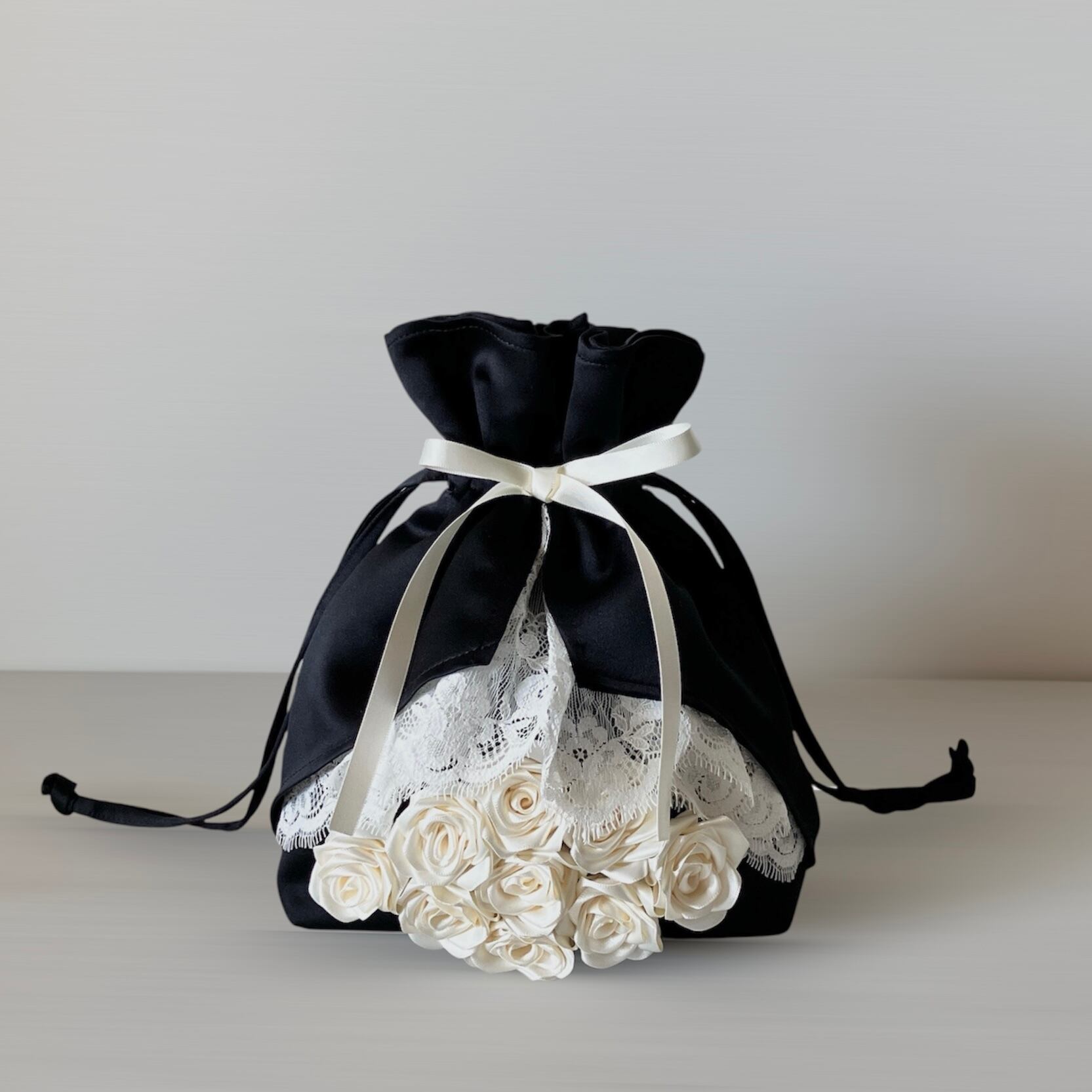 特別な一日を彩る、まるでブーケのようなエレガントな巾着バッグ。 上質な生地と立体的なローズの装飾が、装いを一層華やかに引き立てます。