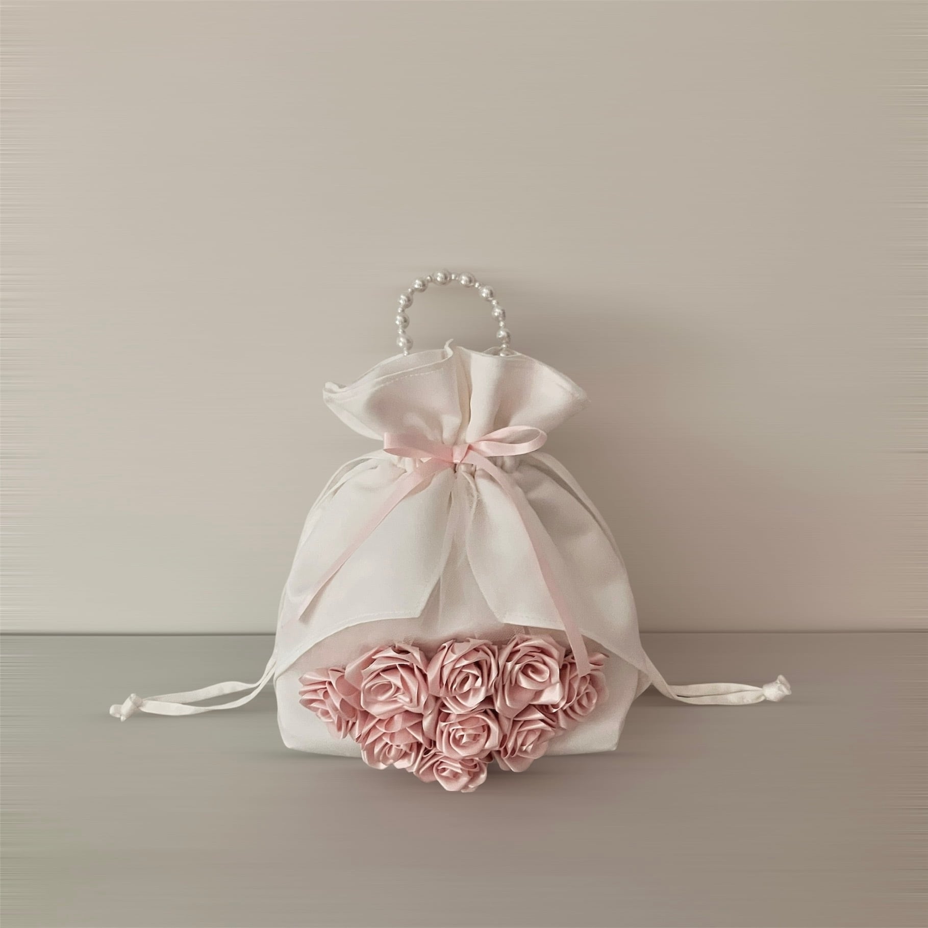 特別な一日を彩る、まるでブーケのようなエレガントな巾着バッグ。 上質な生地と立体的なローズの装飾が、装いを一層華やかに引き立てます。
