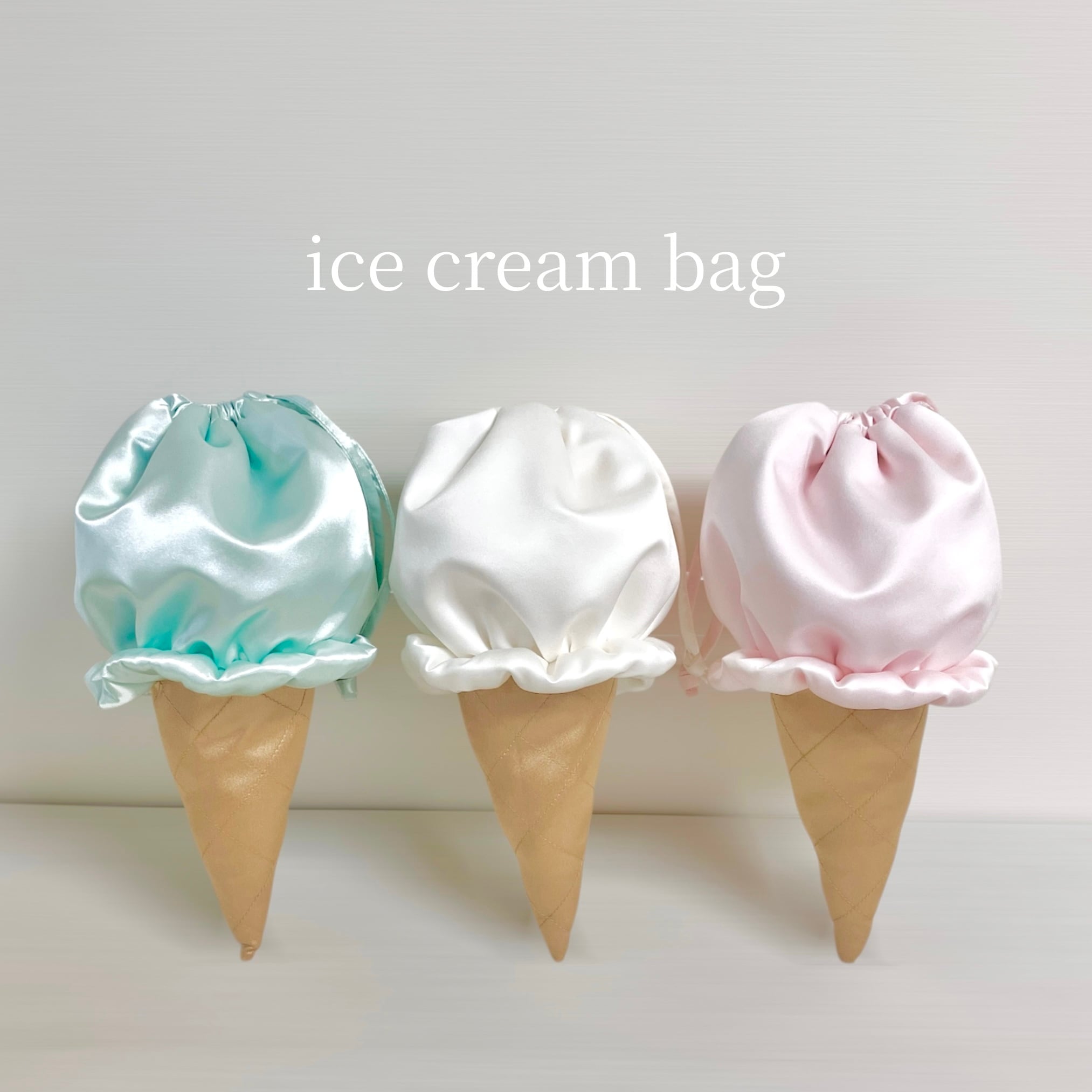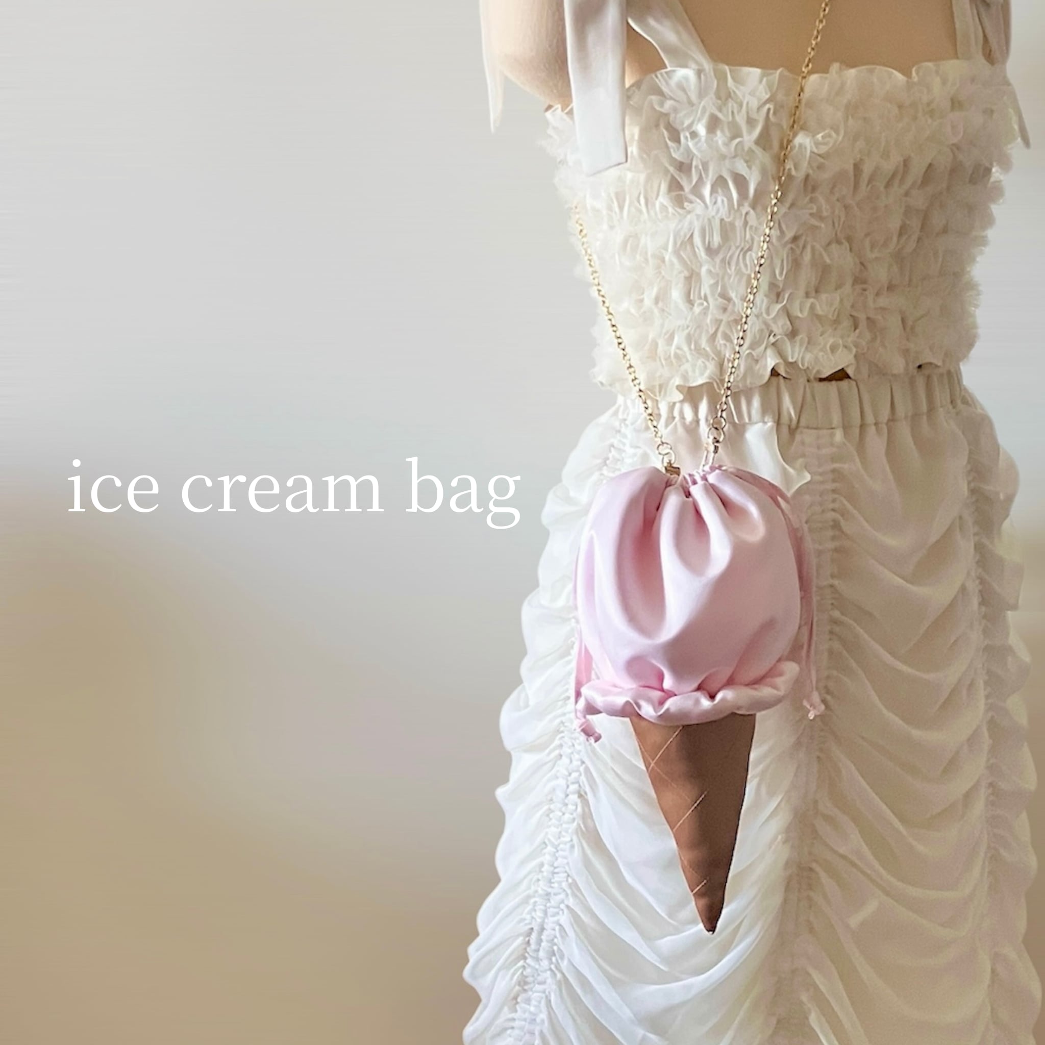 アイスクリームをモチーフにした巾着バッグ。甘すぎない絶妙なニュアンスカラーと上品な素材感で、大人の遊び心をプラスするアクセサリー感覚でお使いいただけます。