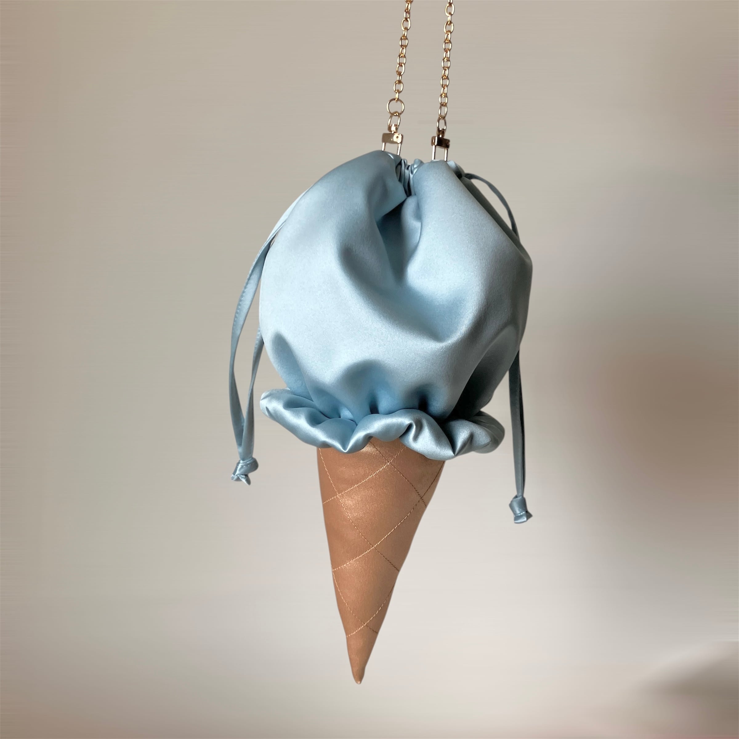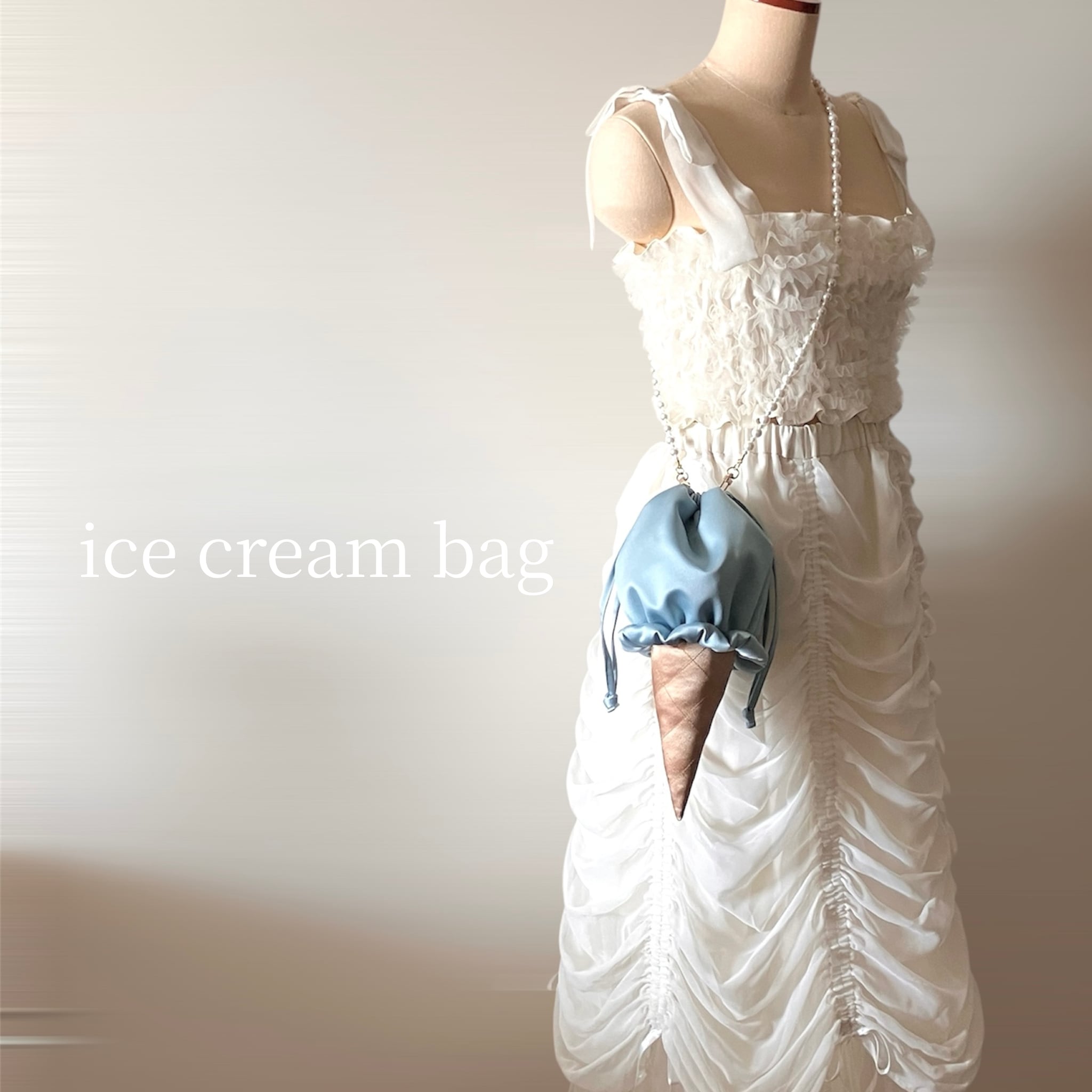 アイスクリームをモチーフにした巾着バッグ。甘すぎない絶妙なニュアンスカラーと上品な素材感で、大人の遊び心をプラスするアクセサリー感覚でお使いいただけます。